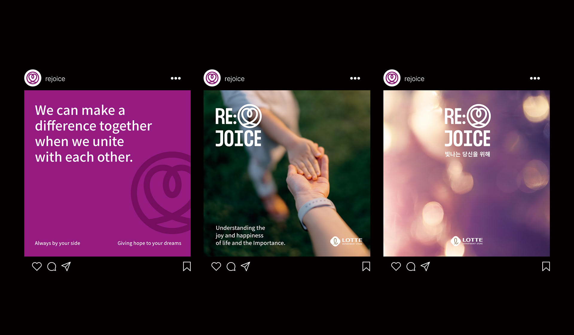 One of Lotte Shopping’s five key ESG initiatives, Lotte’s RE:JOICE is a social contribution campaign brand by Lotte Department Store that provides psychological counseling to customers. The goal of this project was to create a logo that reinforces consistency with Lotte’s RE:EARTH, previously developed by Studio Tangible, and to establish a flexible identity that can embrace diverse values in the future.